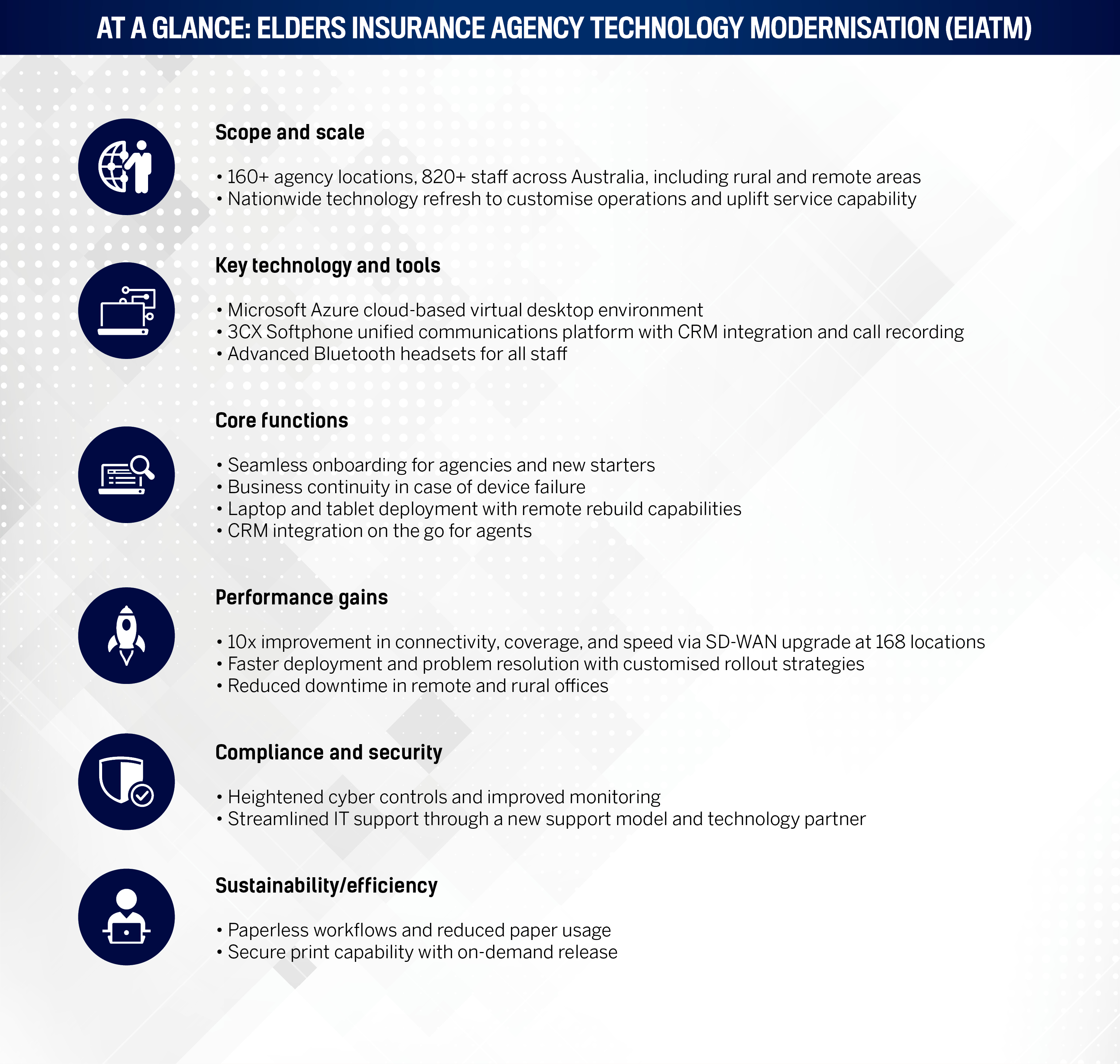 In 2024, Elders Insurance launched the Elders Insurance Agency Technology Modernisation (EIATM) project, a nationwide program to replace outdated systems, modernise workplaces and boost service capabilities. The initiative aimed to create a more flexible, resilient environment for staff across more than 160 agency locations, including rural and remote areas.