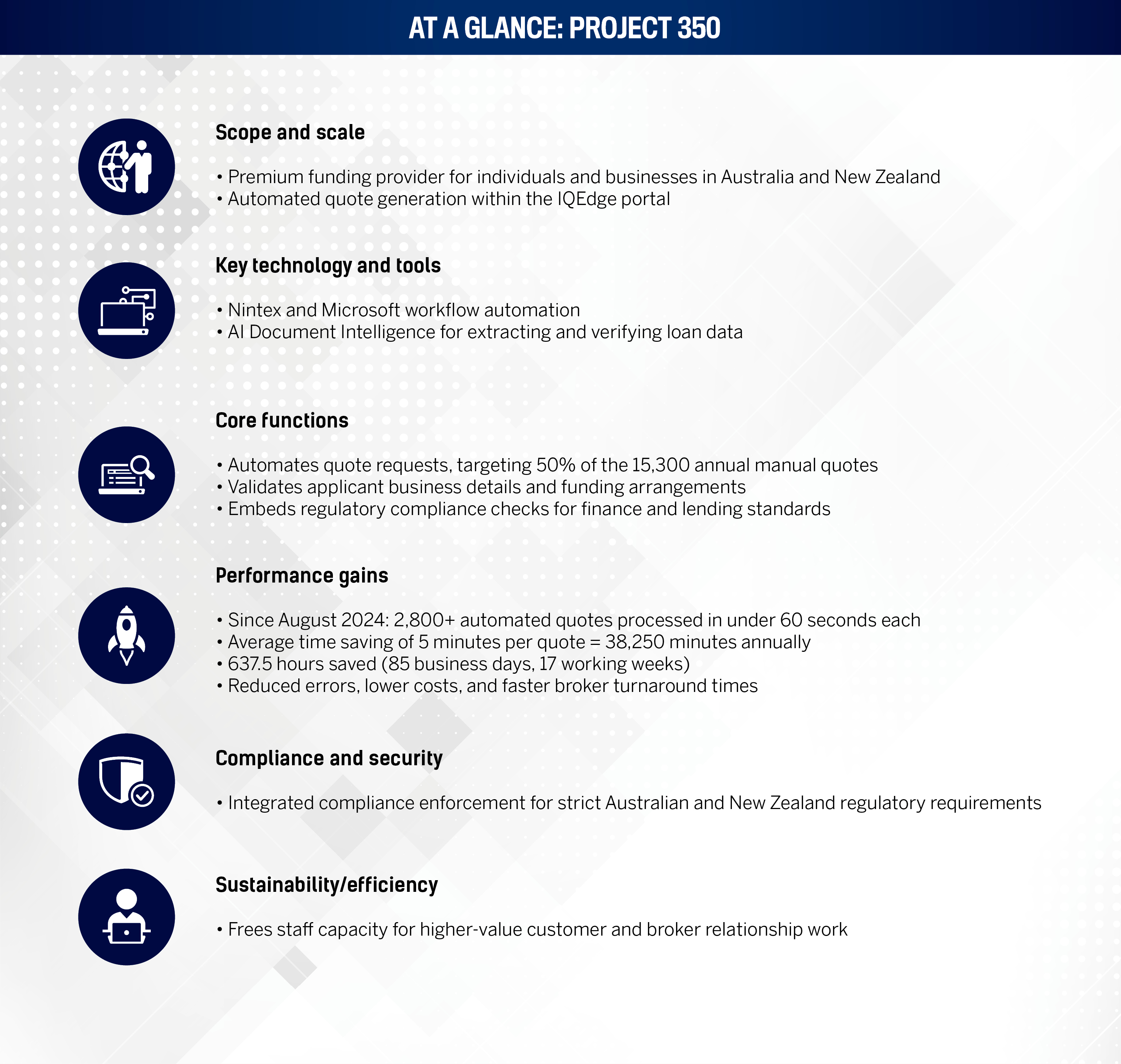 In August 2024, IQumulate Premium Funding launched Project 350 to address a significant operational challenge: the slow, manual process of producing and validating premium funding quotes in highly regulated markets. The goal was to automate nearly half of the 15,300 quotes generated each year, cutting turnaround from hours to minutes.