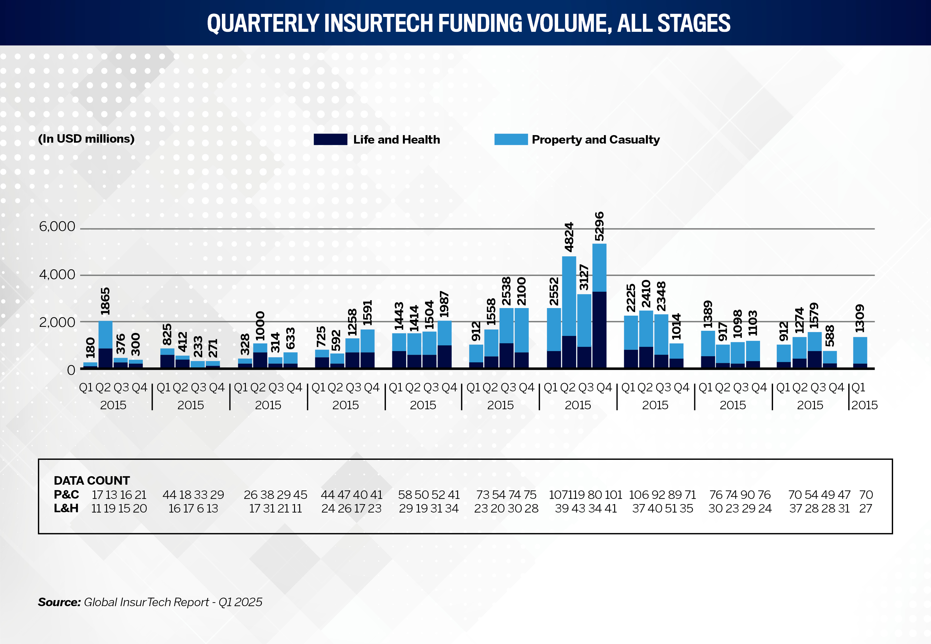 Global insurtech funding climbed to US$1.31 billion in Q1 2025, according to Gallagher Re, driven by US$1.13 billion for property and casualty startups, the highest level since late 2022.