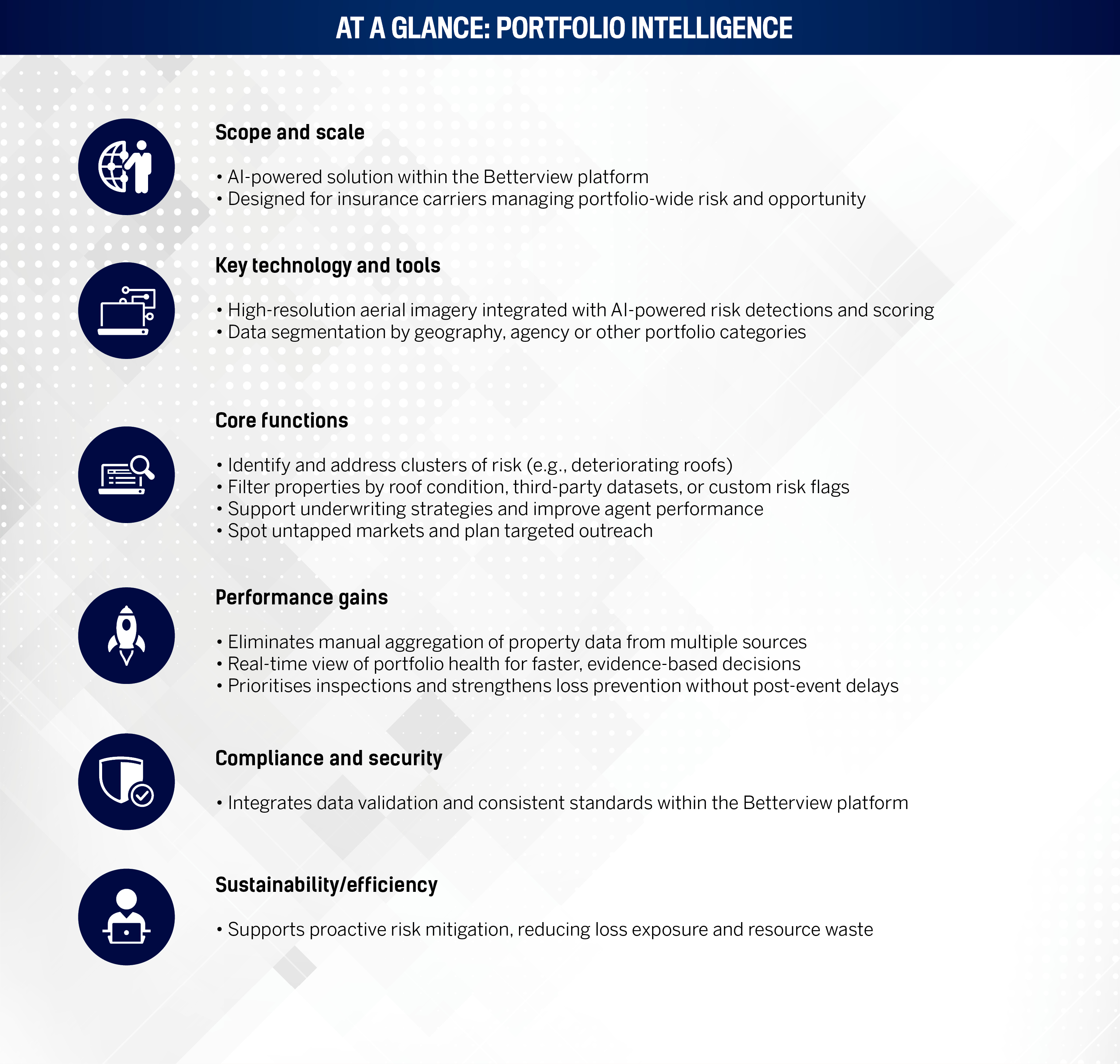 Portfolio Intelligence was introduced in 2024, an AI-powered solution within the Betterview platform that moves insurers from single-property assessments to portfolio-level analysis.