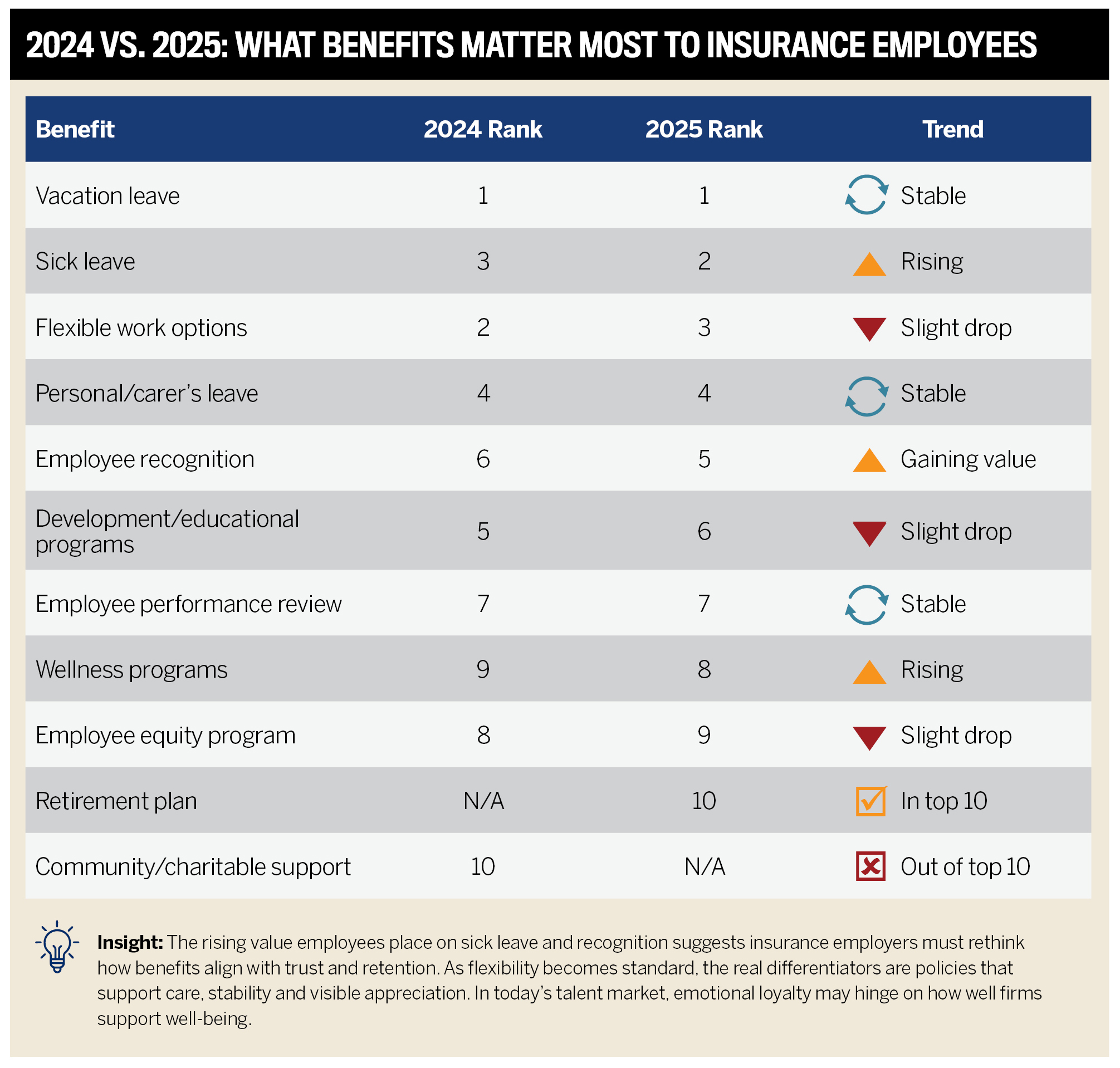 The fundamentals haven’t changed, but people are sketching out clearer boundaries around their priorities. Across 2024 and 2025’s Top Insurance Employers survey, the benefits people cared about most were vacation time, sick leave and flexible hours. This year, sick leave edged ahead, emphasising a stronger focus on health, job security and being part of a caring workplace.