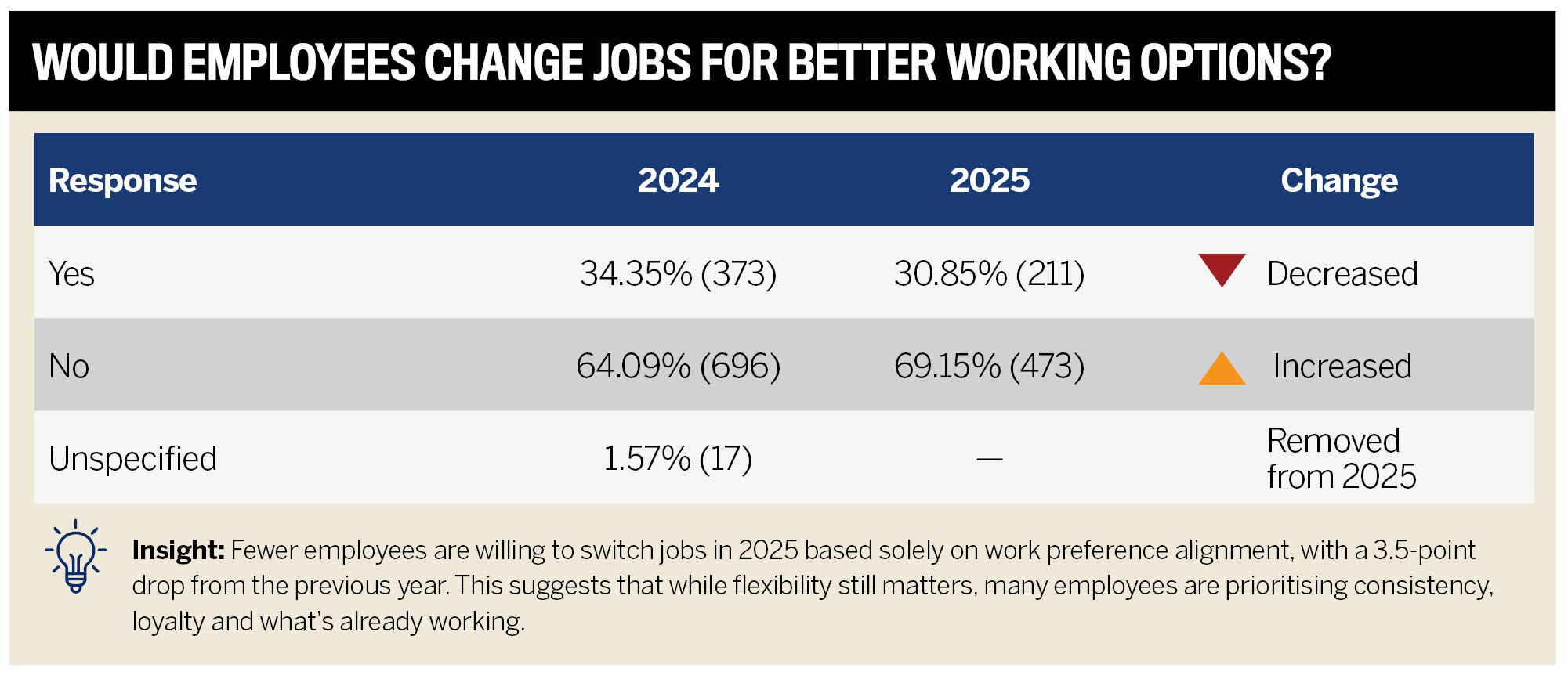 Meanwhile, the share of employees staying put has grown. This year, 69.15% said they wouldn’t consider a switch, a jump of more than five percentage points. It suggests a growing appetite for stability after years of workplace shakeups, especially now that flexibility is commonplace in many roles.