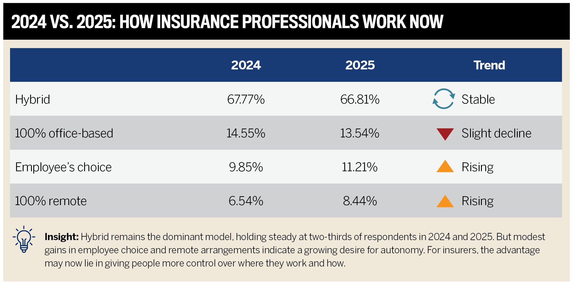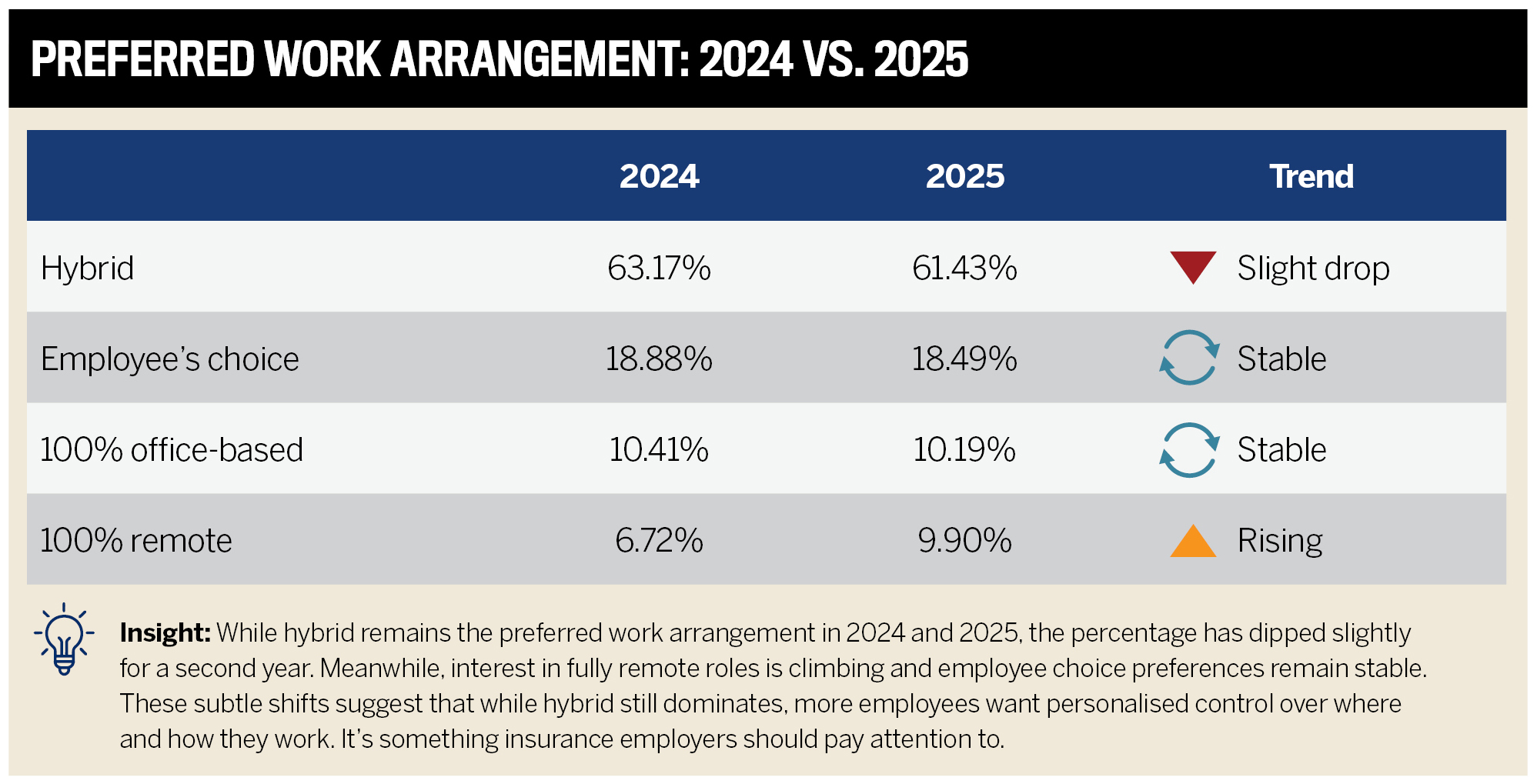 Hybrid work is still the norm in insurance, and the numbers haven’t moved much since last year. But there’s a subtle shift happening in that more employees are leaning into remote setups or choosing arrangements that give them more say. The trend isn’t huge yet, but it’s telling. Flexibility on its own isn’t cutting it. People want control.