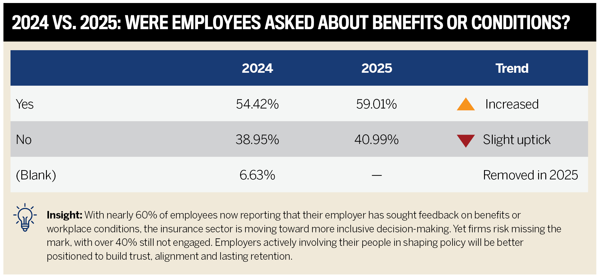 More insurance employers are seeking employee input on benefits and workplace conditions. Participation increased by nearly 5 percentage points from 54% to 59% in just one year. The proportion of employees who said they weren’t consulted also rose slightly, highlighting that while progress is being made, it’s uneven.