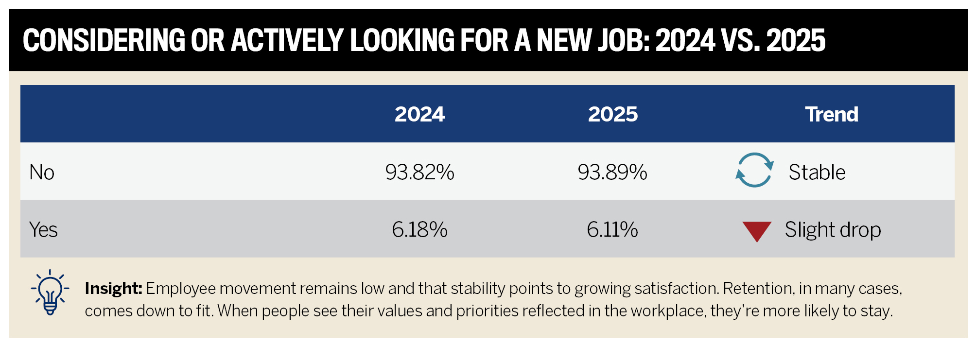 In 2024 and 2025, fewer than 7% of employees said they were actively looking for a new role. The number moved by just 0.1 points. On the face of it, it suggests a steady workforce – but there’s more to it than that.
