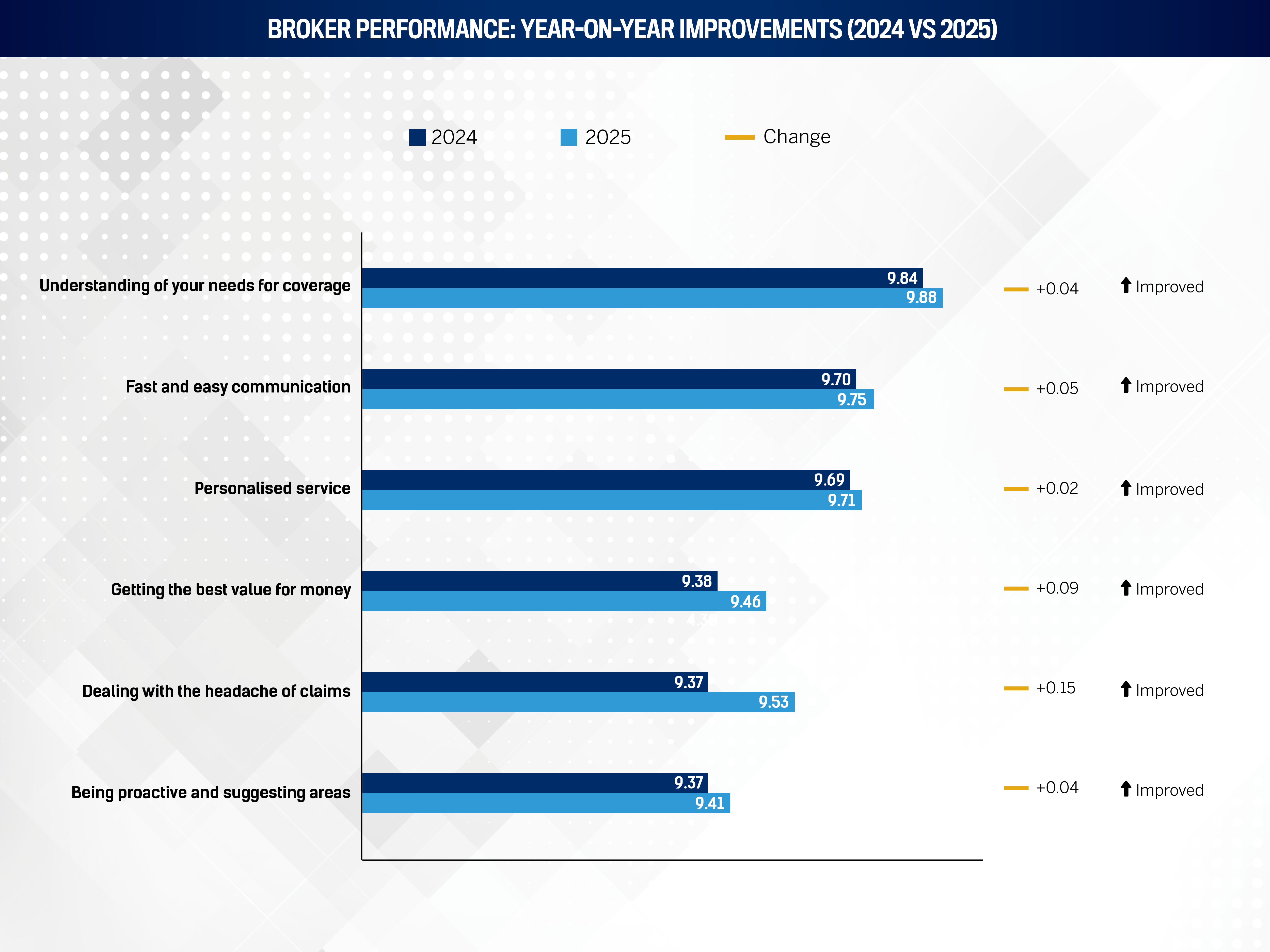 Improvement reason: Brokers’ ability to compare multiple insurers and negotiate on behalf of clients has improved, aided by technology and stronger insurer relationships. This has led to better deals and more tailored coverage, directly impacting perceived value.