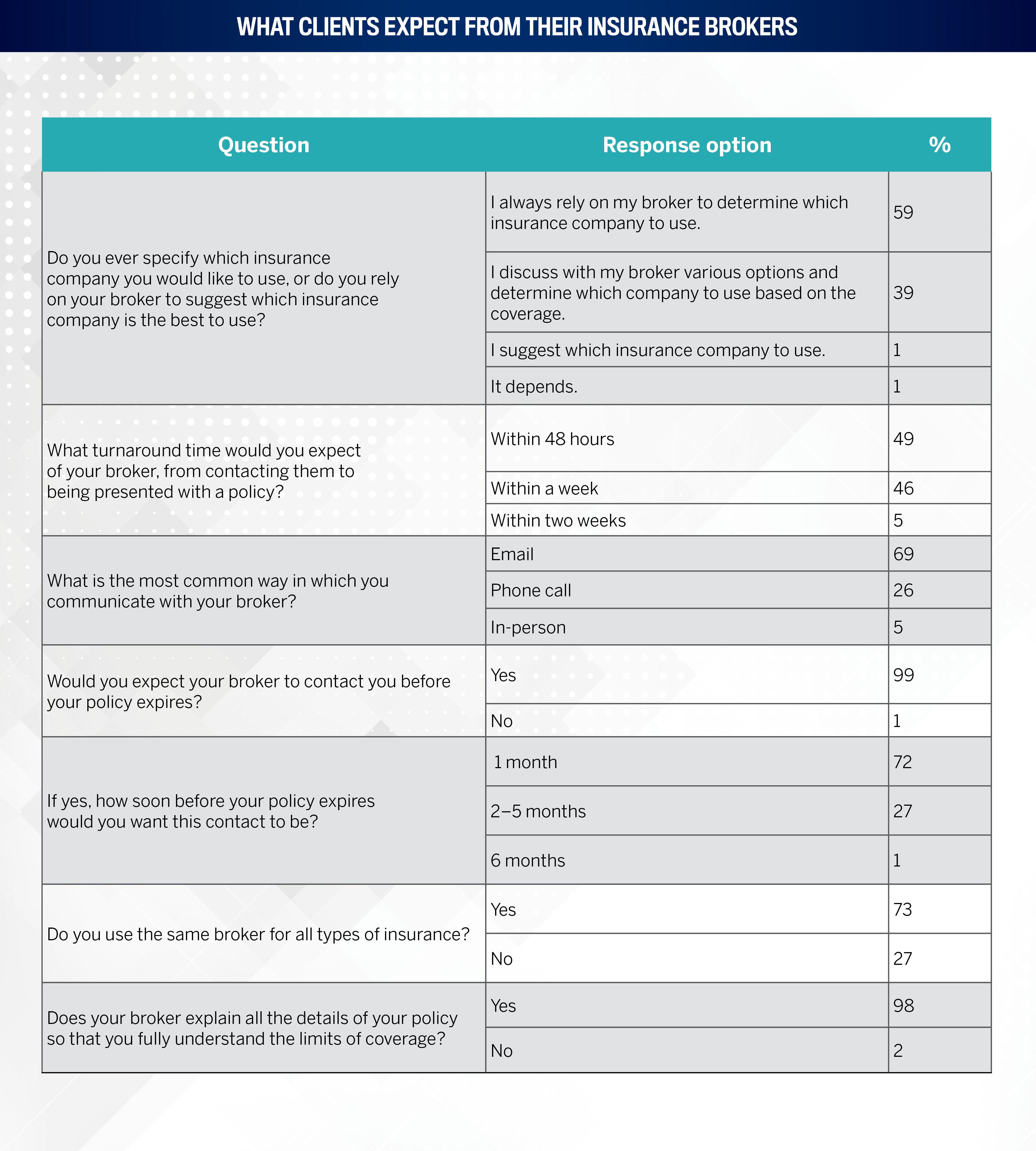 Improvement reason: Brokers are increasingly leveraging advanced client management systems and data analytics to gain deeper insights into client profiles and evolving risks. This enables them to tailor coverage more precisely to individual or business needs, resulting in higher client satisfaction.