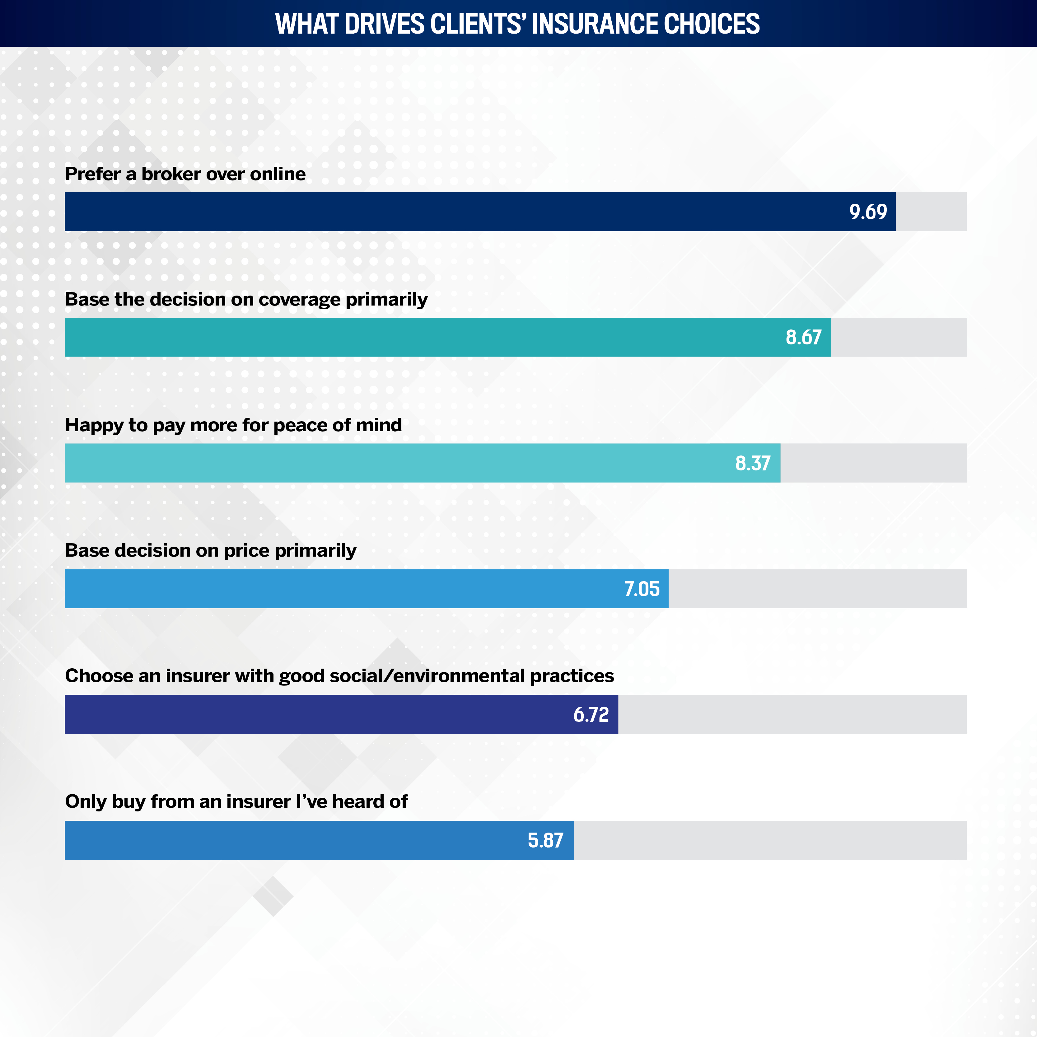 Brand recognition less critical: Brand familiarity is less important than coverage, price or broker recommendation. Clients trust their broker to recommend reputable insurers, even if they are not household names.