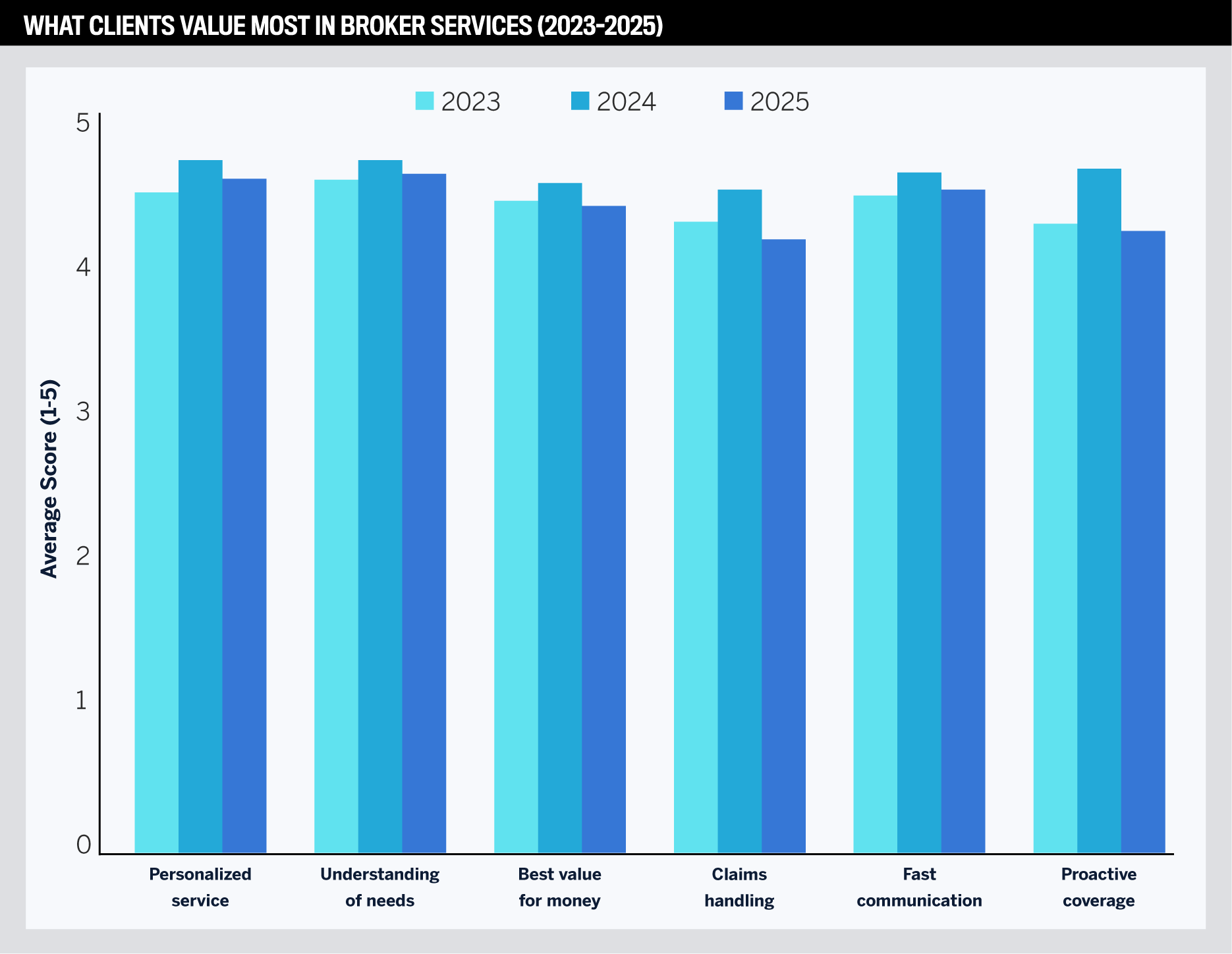 Clients in 2025 say the best brokers are the ones who understand their coverage needs and share advice that feels personal. Communication, value, and proactive guidance follow close behind, with claims support still viewed as an essential part of the package. Respondent brokers rated using a scale where 1 is not important and 5 is most important.