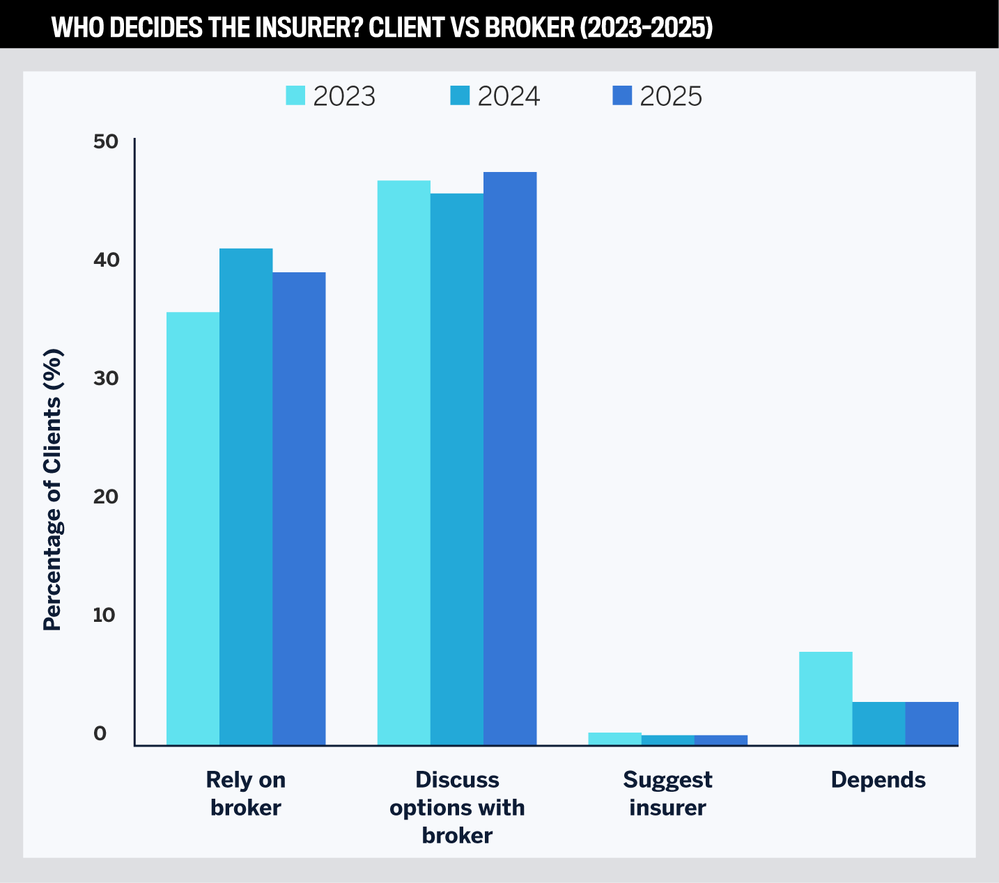 Clients overwhelmingly trust their brokers to guide insurer selection. The majority either rely entirely on their broker’s judgment or make the decision together after reviewing options, underscoring the broker’s role as both advisor and advocate in navigating the market.
