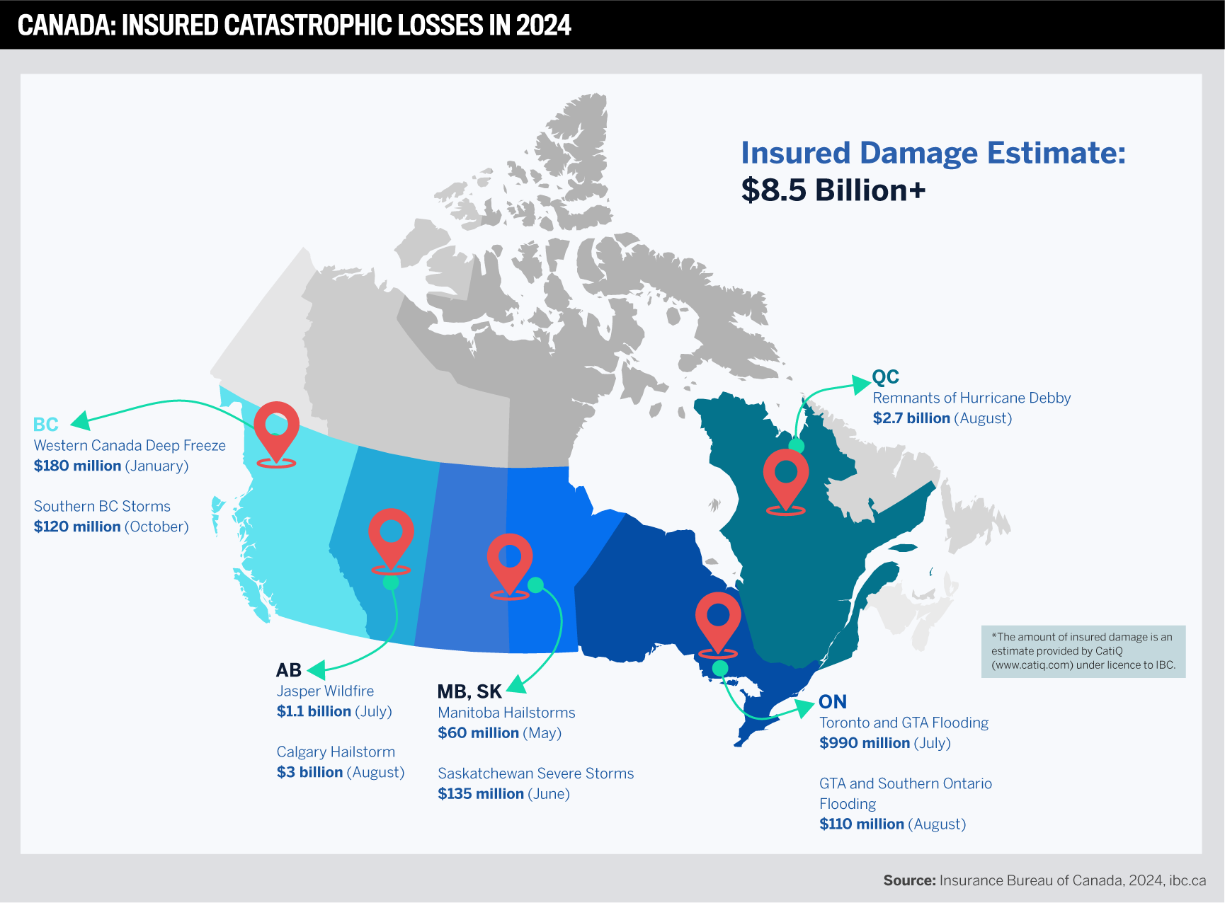 Climate-driven claims: Calgary’s 2024 hailstorm caused about $2.8 billion in insured damage, part of the record-breaking year; wildfire and flood exposures continue to test capacity.