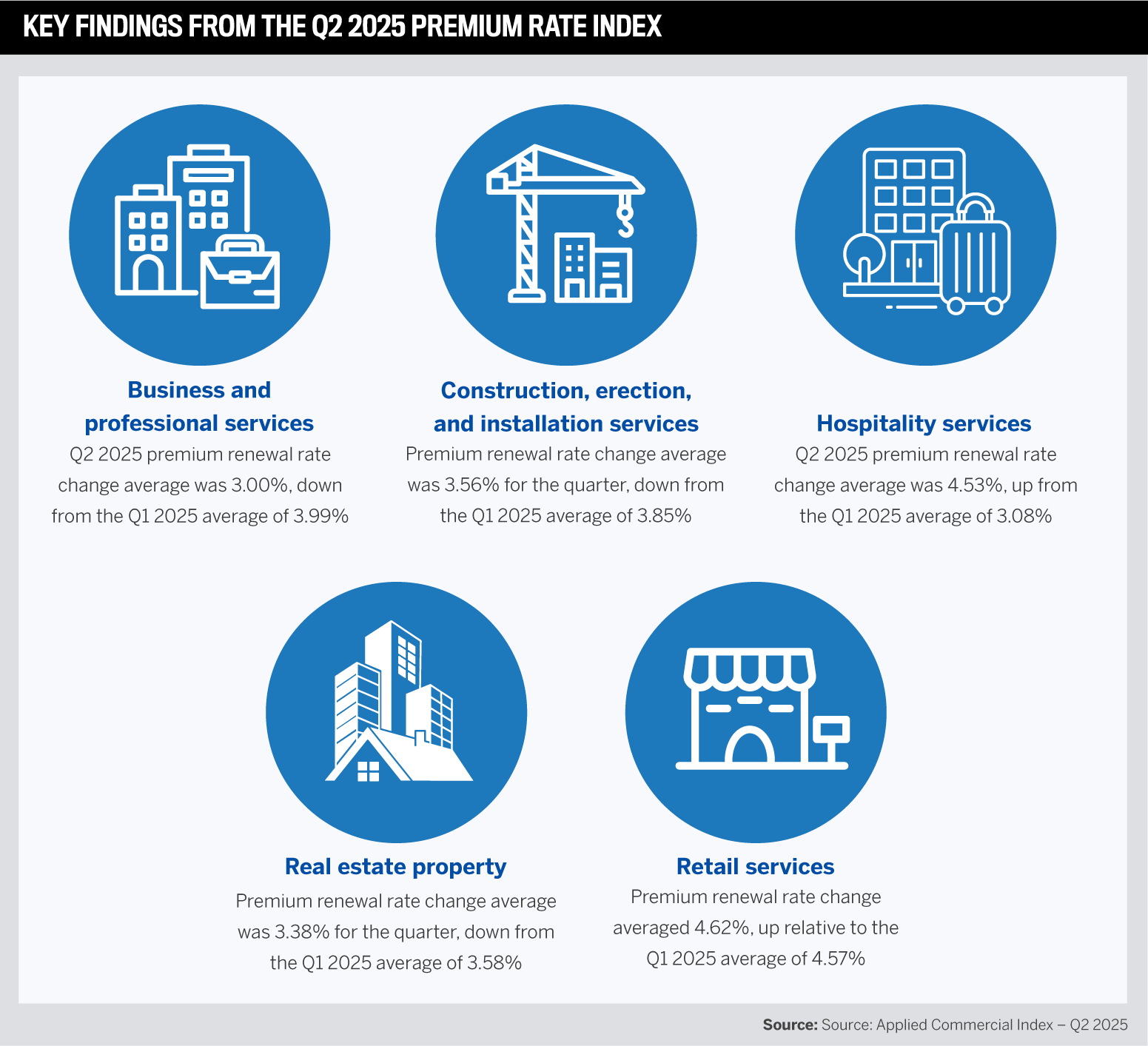 Premium moderation: Q2 2025 saw average commercial rates fall 4 percent, with property down 6 percent and casualty down 2 percent.
