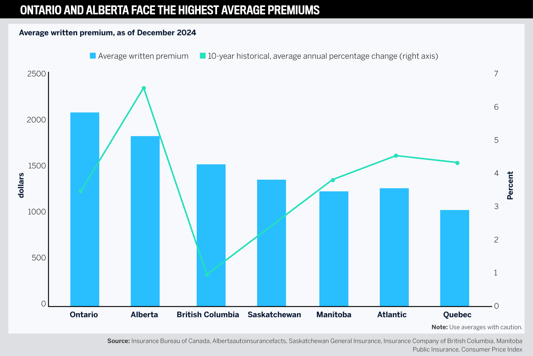 Premium hikes: Personal auto rates rose an average of 13 percent year on year in Q1 2025, with Ontario up nearly 15 percent.
