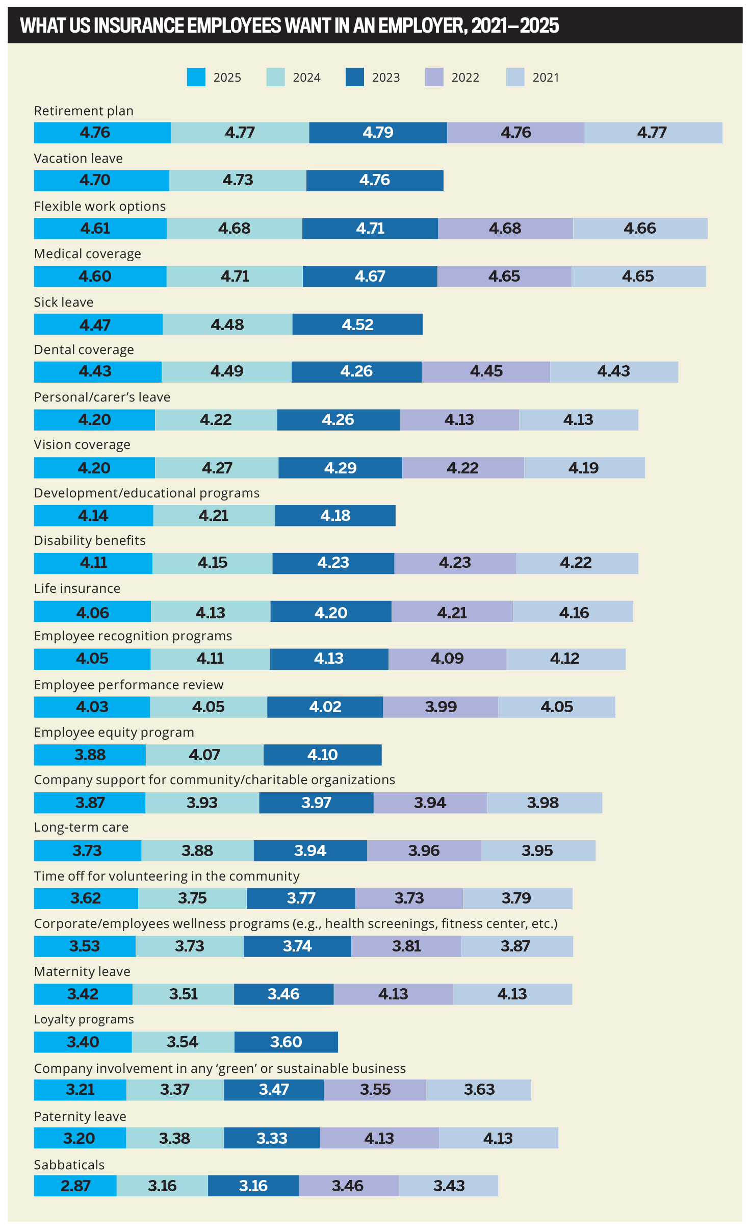 These benefits consistently score above 4.4, indicating they are seen as very important. Retirement plans and vacation leave are the highest rated, with only slight fluctuations year to year.