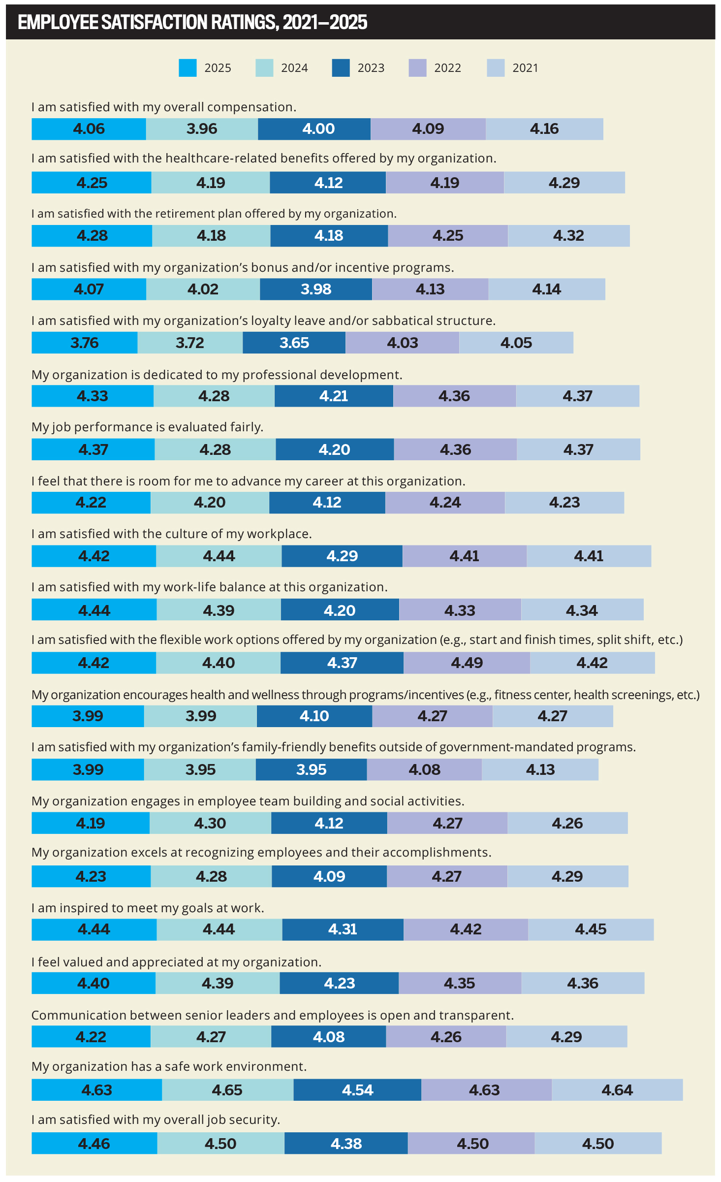 Satisfaction remains high: Workers are generally satisfied with their employers, especially regarding safety, job security, culture, and flexibility.