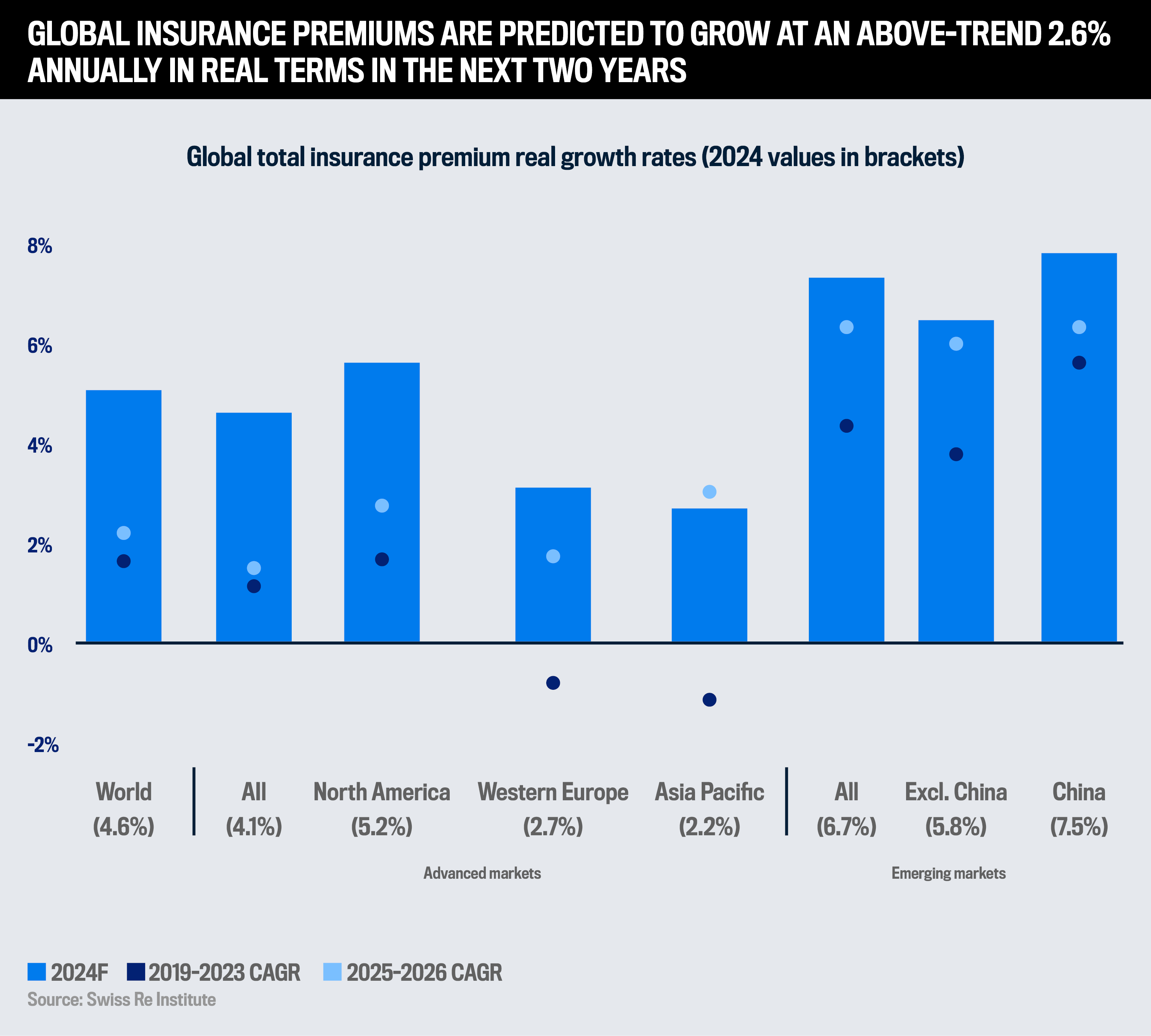2024 sparked a recovery in global total insurance premiums, which rose by 4.6%, compared to the 1.6% average between 2019 and 2023.