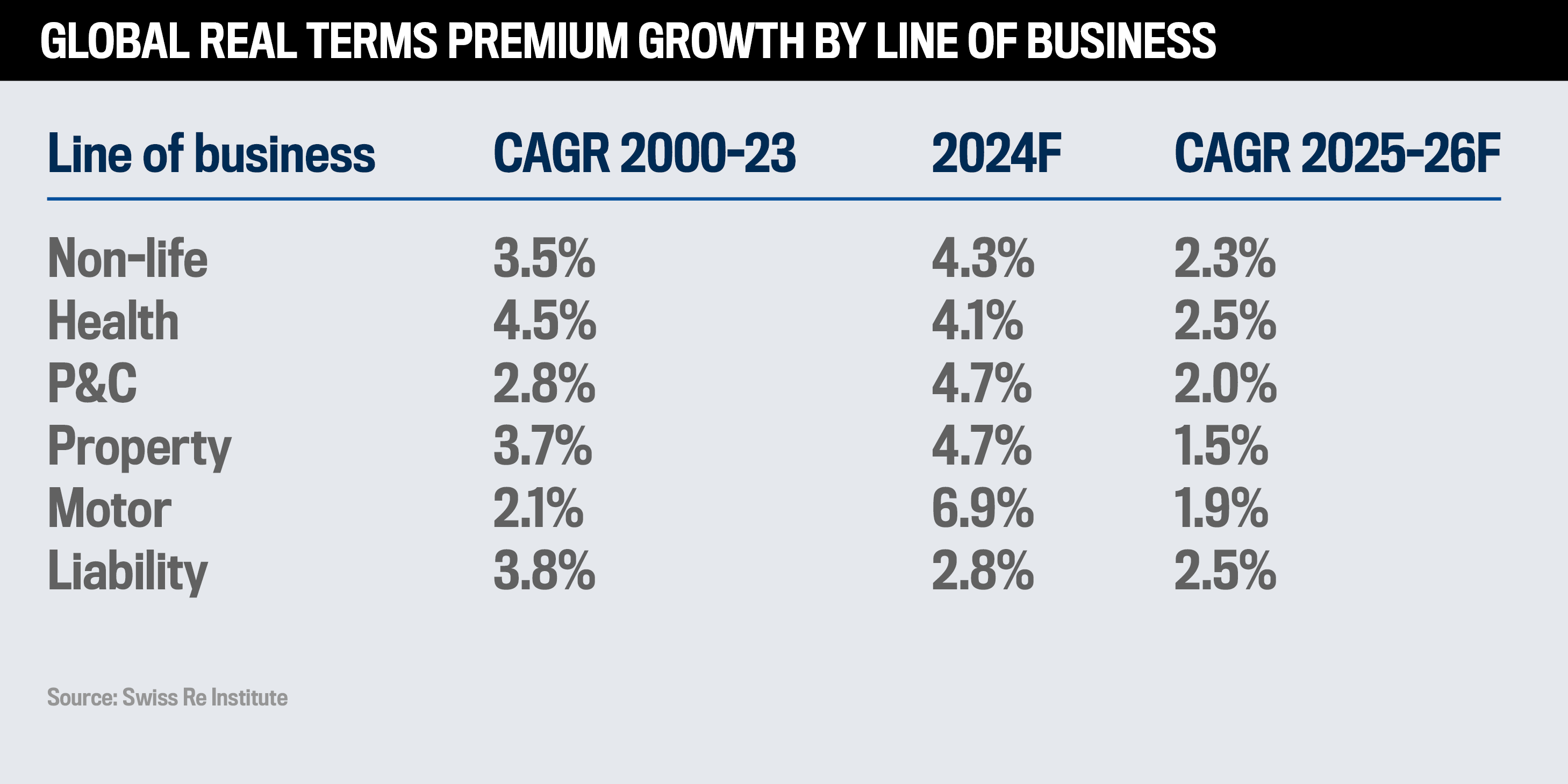 Swiss Re Institute expects growth “to be primarily driven by the life sector, although saving business growth will moderate as interest rates decline. Non-life insurance will grow more slowly than in recent years as the boost from the hard market tapers down. Life and non-life (including health) premiums accounted for 43% and 57% of total premium in 2024, and we expect this mix to stay largely the same over the next decade.”