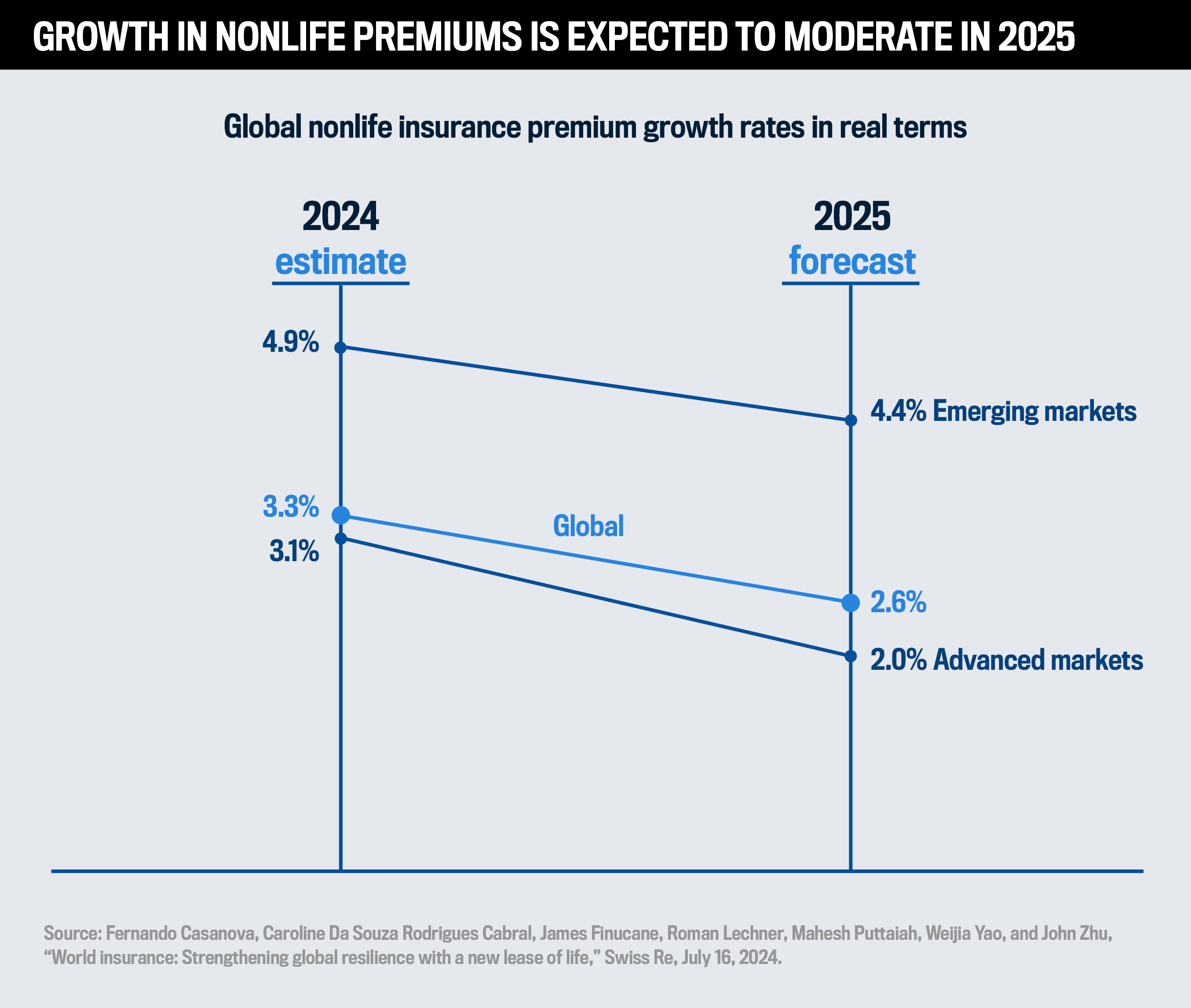 Deloitte’s 2025 global insurance outlook states, “At a global level, estimates suggest that insurers’ return on equity could improve to about 10% in 2024 and 10.7% in 2025. Insurance premiums are estimated to grow by 3.3% in 2024, with advanced markets contributing 75% of the expansion in premium volumes.”