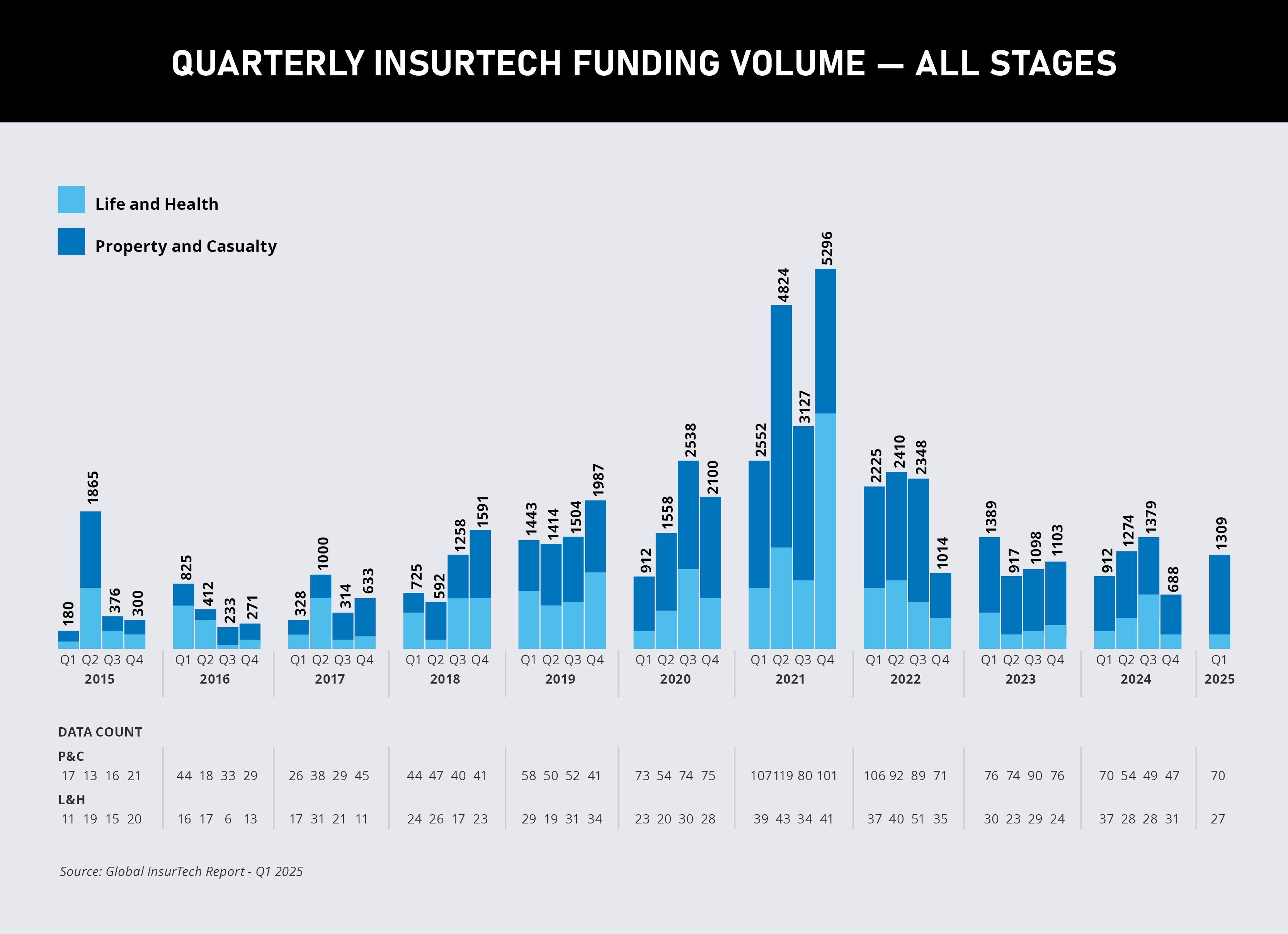 • Global insurtech funding surged 90.2 percent quarter over quarter, reaching US$1.31 billion, the highest level since late 2022