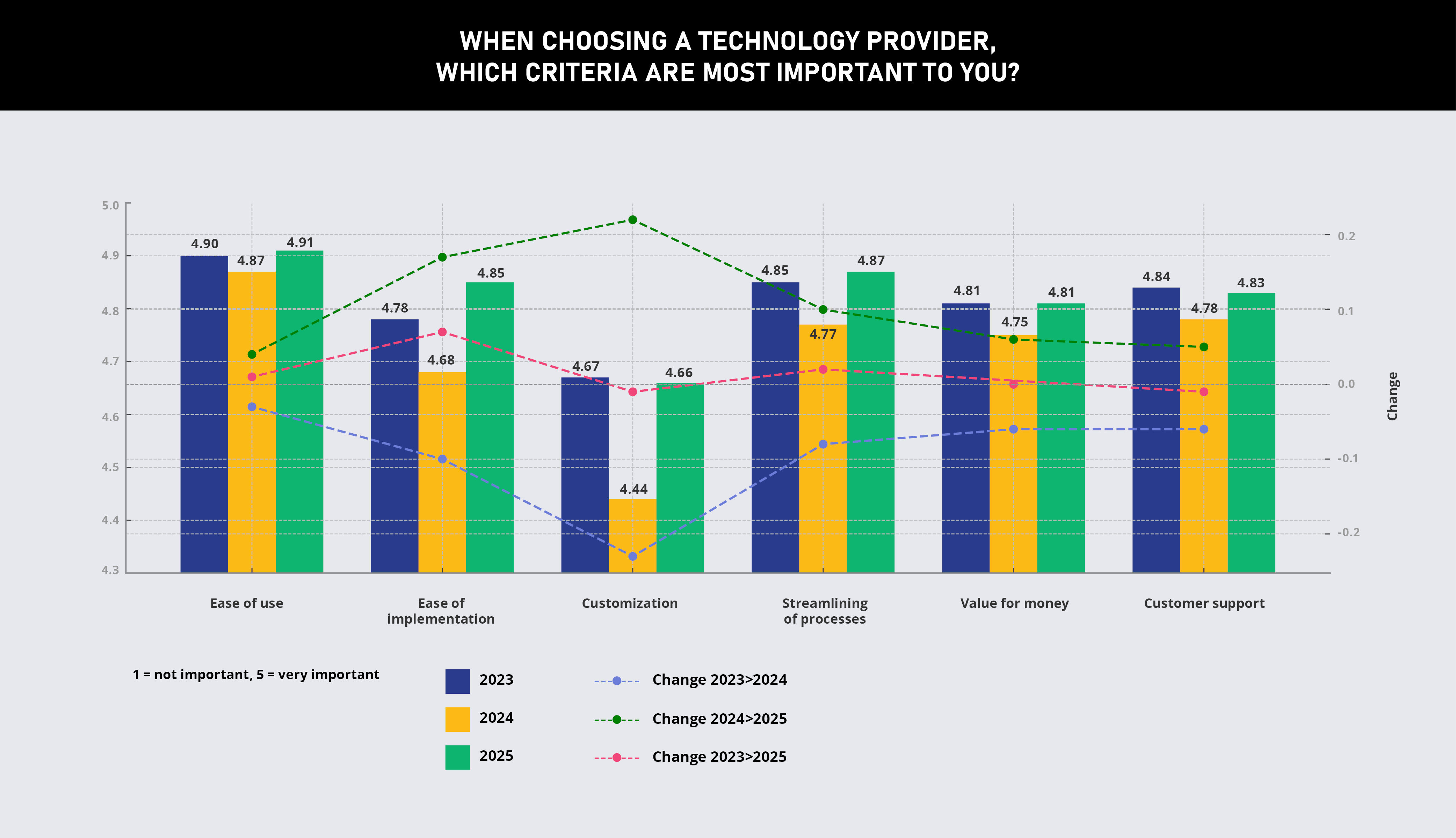• 2024 dip: All criteria experienced a dip in 2024, suggesting either higher expectations or market challenges.